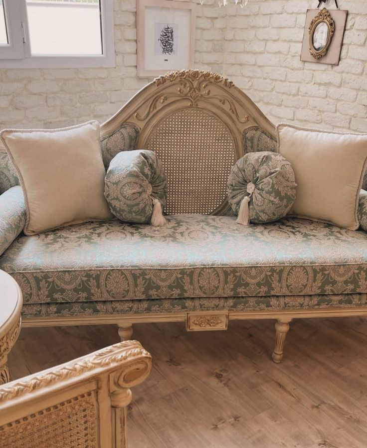 The sofa features a beautiful woven cane backrest, lending it a light, airy charm reminiscent of colonial and heritage-style décor. The intricate carvings on the frame are complemented by luxurious patterned upholstery in soft, muted tones — a perfect balance of opulence and subtlety. Designed to harmonize with both classical and contemporary interiors, this piece instantly elevates the aesthetic appeal of your home.