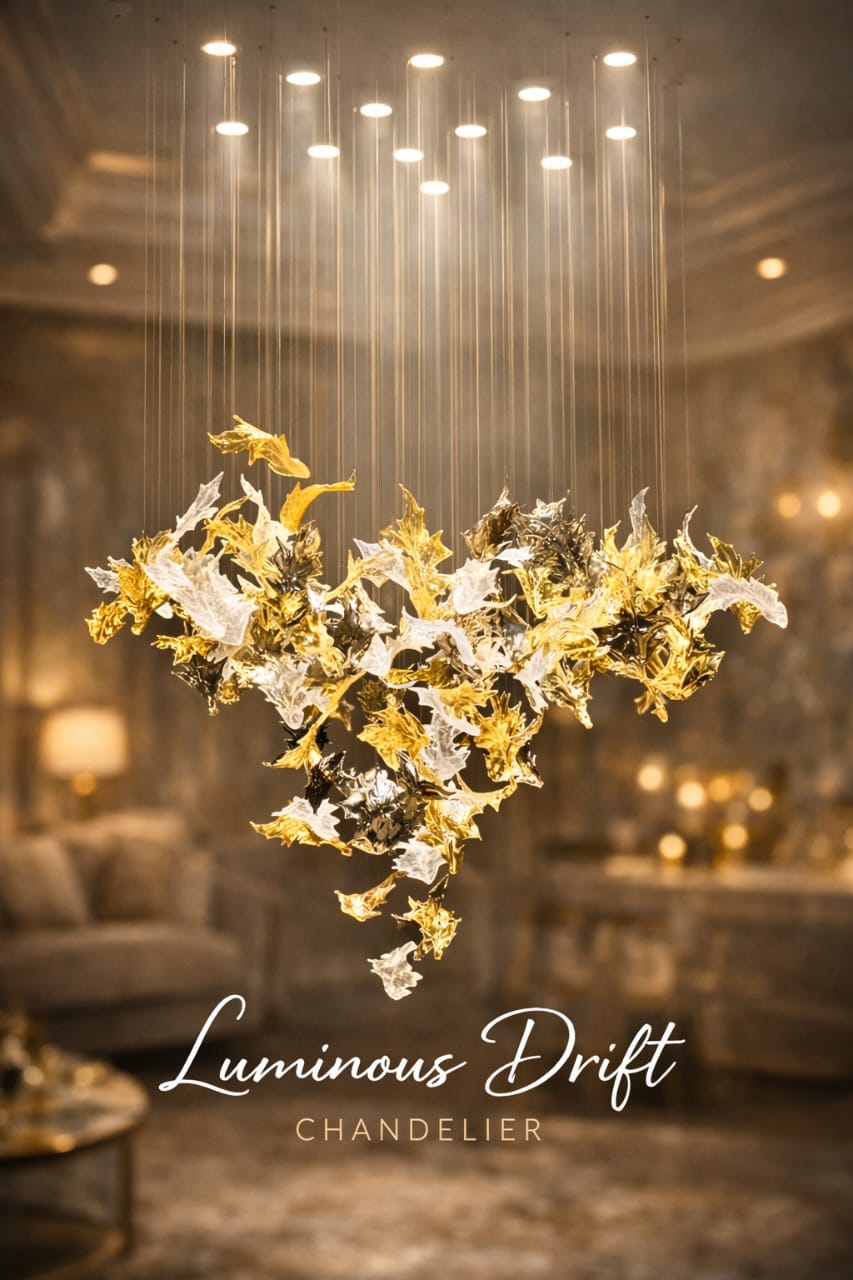 Ideal for statement interiors, this chandelier transforms ceilings into artistic focal points while maintaining warm, ambient lighting suitable for everyday use. Whether positioned above a grand dining setting or within a lobby environment, Luminous Drift introduces refinement without visual heaviness.