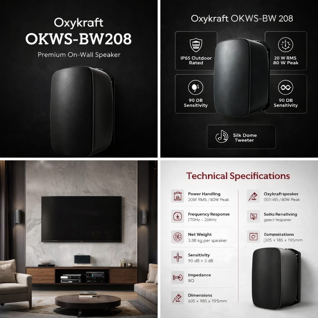 Looking for a premium on-wall speaker in India that delivers crystal-clear sound both indoors and outdoors? The Oxykraft OKWS-BW 208/LM is designed for homeowners, cafes, offices, and commercial spaces that need reliable, high-performance audio with sleek aesthetics.