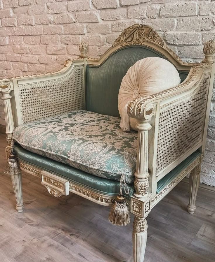 The frame’s ornate carvings and classic cane side panels reflect the beauty of vintage European design, adding depth, texture, and authenticity to any setting. Each element is carved and polished by hand, giving the chair a distinct character that mass-produced furniture can never replicate. Whether placed in a cozy reading corner, an elegant living room, or a refined lounge, this armchair becomes an instant focal point that blends tradition with timeless elegance.